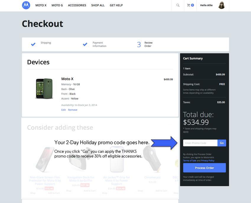 From 12pm noon (Eastern) on Monday, December 9th, a registration form will go live at motorola.com/holiday2daysale. You then have to register and wait for Motorola to email you your unique, one-off code. Once you have your code, you have two days to redeem it. Codes expire at Midnight (Eastern) on December 11th. You’ll also be able to get 30% off select accessories by entering the code “THANKS” at checkout.
