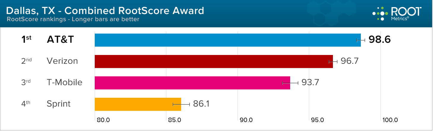 With that said, first place in the combined RootScore aware went to AT&T. Combining network reliability and speed gave “Big Blue” a points score of 98.6 out of 100. Verizon finished 2nd with 96.7, with Tmo only a few points behind in 3rd, with 93.7.