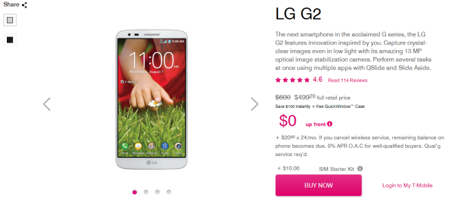 This might just be one of the bargains of the century so far for T-Mobile users. If you head on over to the LG G2 product page, you’ll spot the price has dropped from $600 to $499.20. On EIP, that’s $0 down and 24 monthly payments of $20.80. So, that’s a high-end “phablet” for the same price as a “regular” smartphone.