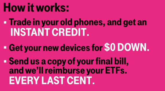 Worst case scenario: There are five of you and each of you has $350 to pay in ETFs. That’s $1,750, and T-Mobile will pay every cent of that, as well as giving you the trade-in value of your phone.
