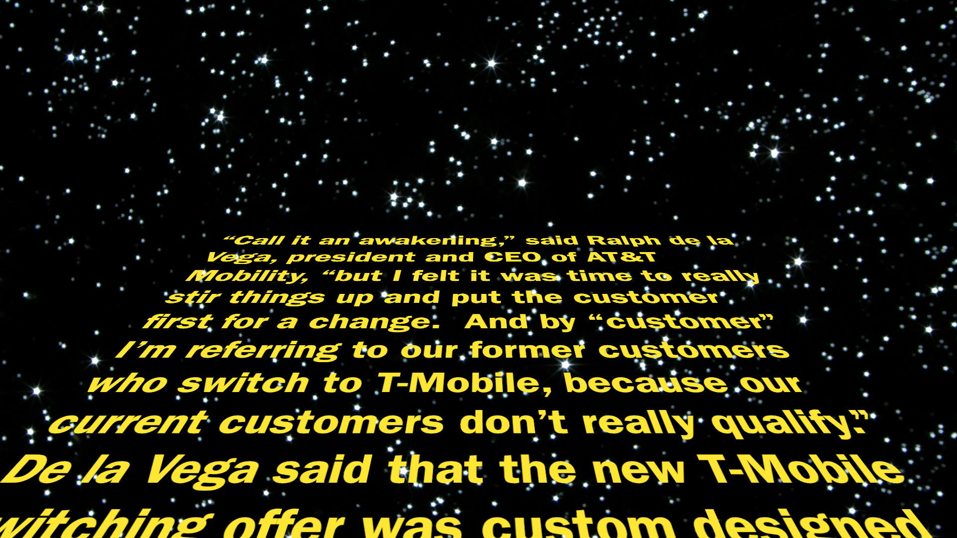T-Mobile has been a little too cocky, perhaps too playful. The press release pictures AT&T as Darth Vader, and pictures one of the most iconic scenes in cinema history. Except it feels a lot more like a Tom and Jerry cartoon. At least it does to me.