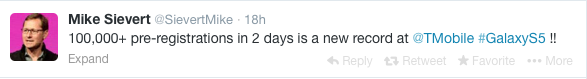 On Monday afternoon, Samsung took the wraps off its latest flagship device: The Galaxy S5 split opinions among tech enthusiasts, but it’s clearly proving a hit with consumers. Only two days after opening up pre-registration for the device, T-Mobile has collected more than 100,000 submissions on its registration page.