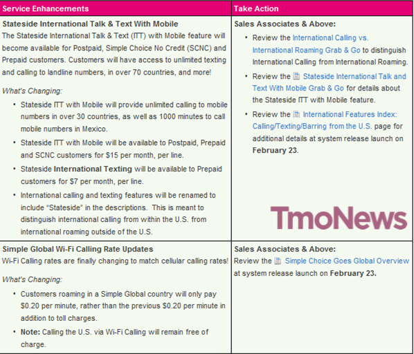 According to the leaked information we’ve received, Tmo is set to revamp its current International Talk & Text options. Not only is the name changing to “Stateside International Talk & Text”, to help distinguish between that and international roaming, but the company’s also introducing a new $15 plan.