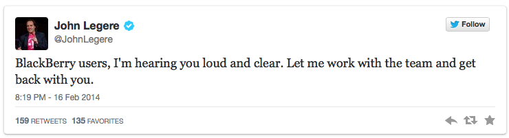 See, by this stage in the development of the smartphone market, the people still using BlackBerries are the loyalists. If they were going to switch to iOS, or even Android for that matter, they would have done so already. So, getting this message through from Magenta was like a kick in the teeth, and they responded by complaining to John Legere on Twitter. He responded: