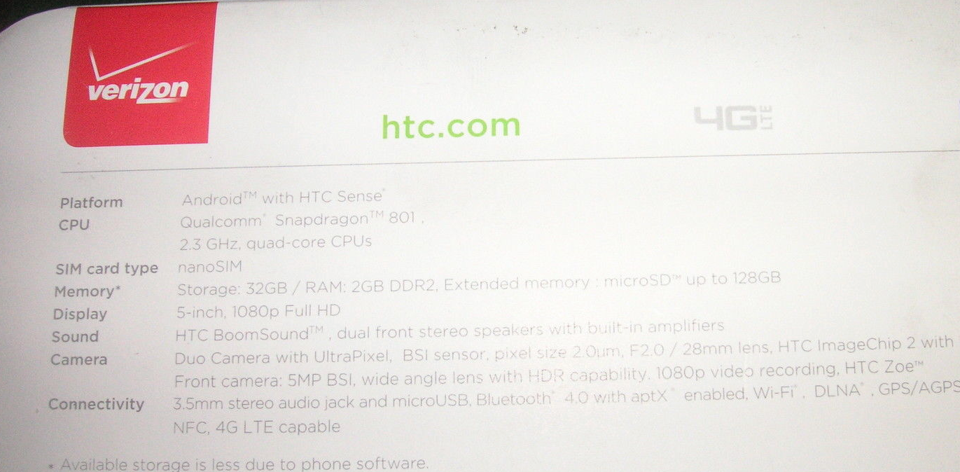 Thanks to leaked images of the retail packaging (sorry, Verizon again), we also know the specs of the device in question. It has a 2.3GHz quad-core processor, 32GB storage with 2GB RAM. On the front is a full HD (presumable LCD) 5-inch display and a 5MP front facing wide-angle camera as well as the iconic BoomSound speakers. On the back is a Duo Camera to be used for adding extra depth of field to your shots.