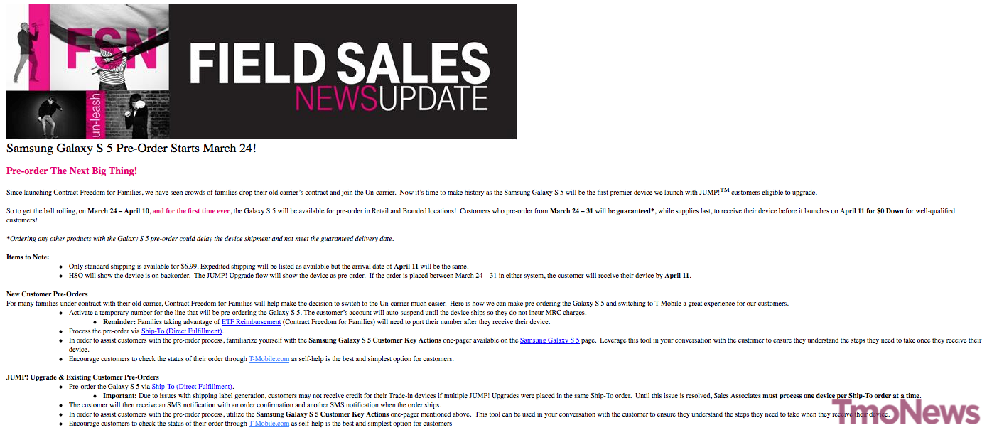 On to JUMP! upgrades, and it appears that you will be able to pre-order as well, you don’t have to wait until the item is physically in stock. Galaxy S5 will show as if it’s on backorder. Retail staff are reminded in the memo that they use “Ship-To (Direct Fulfillment)” on their in-store POS systems, and that they should only process one device at a time, even if customers are JUMPing. This is due to a trade-in system issue.