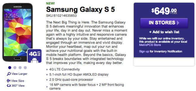 MetroPCS announced today that it’s now selling the Galaxy S5 online and in stores. The 16GB Charcoal Black version of Samsung’s new flagship will set MetroPCS customers back $649 plus tax. Spec-wise, the Metro version of the S5 is similar to all of the other carrier models, meaning it’s got: