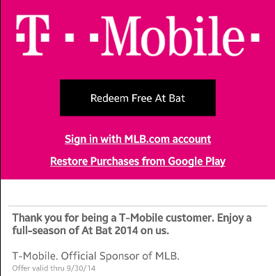 However, delving through T-Mobile’s support pages revealed the following: “Try streaming a game and it should offer the option to “Redeem Free At Bat”. It also says, “Thank you for being a T-Mobile customer. Enjoy a full-season of At Bat 2014 on us.”