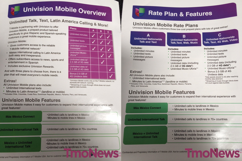 Each Univision Mobile plan will also come with unlimited international texts, and will come with minutes (landline or mobile) to Latin American countries. Those include Chile, Columbia, Costa Rica, Dominican Republic, Mexico, Panama, Peru and Venezuela. As well as that, you’ll get unlimited calls to landlines in 70+ international countries. Interestingly, the internal documents make a distinction between “unlimited” and “minutes” when differentiating between landlines and mobiles in Mexico, as well as Latin American countries. One presumes that’s because when plans are made public, they’ll have a set number of minutes included for those calls.