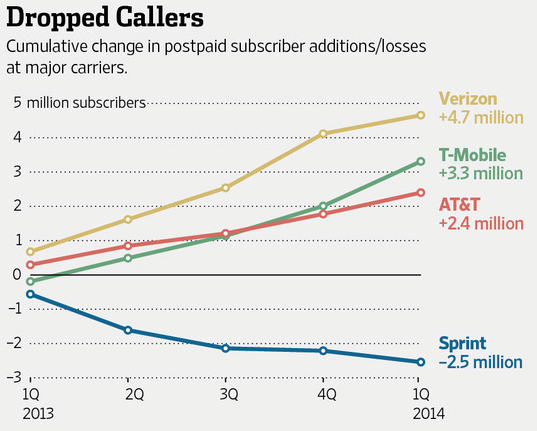 And those aren’t the only concerns. T-Mobile and Sprint individually both lost money last quarter. Neither is really making any profit – as mentioned previously. And while T-Mo is gaining a lot of subscribers, Sprint is losing a lot. Looking at just postpaid subscribers, Sprint lost 2.5 million over the 5 quarters between Q1 2013 and the end of Q1 2014. The Uncarrier gained 3.3 million. Evened out, that’s a gain of just 800,000 postpaid subscribers between them over 15 months.