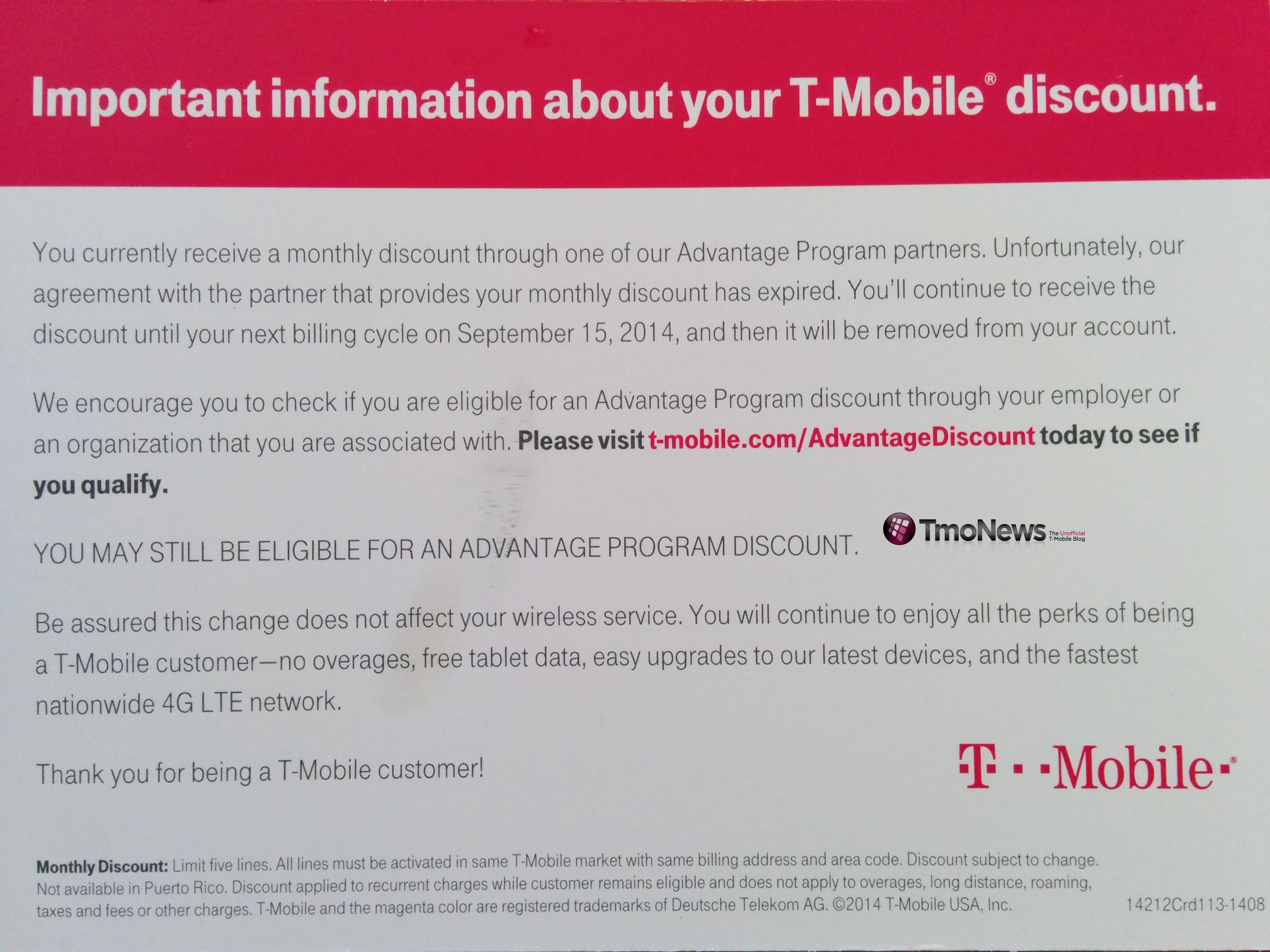 UPDATE – If you haven’t been sent a notice and you currently receive a discount, please don’t take this as a sign that you’re going to lose yours. Unless T-Mo gets in touch, via text or post card, there’s no need to worry.