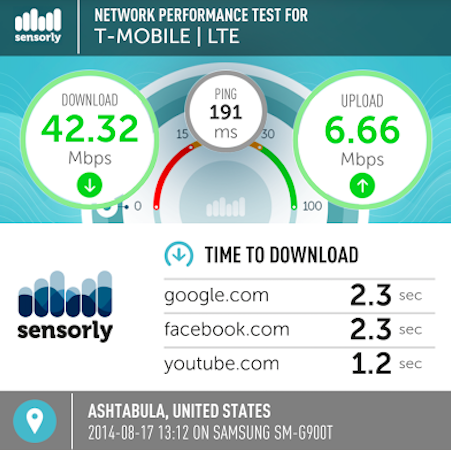 A T-Mo customer and TmoNews reader has been testing the network in and around Geneva and Ashtabula, Ohio and it would seem T-Mobile is busy activating the LTE network in those towns. Head on over to the Sensorly coverage map and you’ll see some purple blobs denoting LTE coverage around Geneva, and up the main highway between the two locations. Speeds around Ashtabula are very encouraging too. Our reader managed a download speed of around 42Mbps (as seen in the screenshot below):