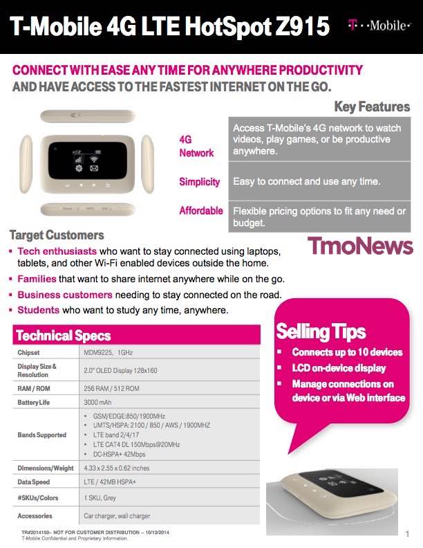 A short while back, we heard T-Mobile was working on a brand new LTE Z64 personal hotspot in conjunction with ZTE. Today, we’ve been sent more information on another similar device, which looks set to launch within the first couple of weeks in November. The release date was pointed to in a leaked memo obtained by Windows Central: