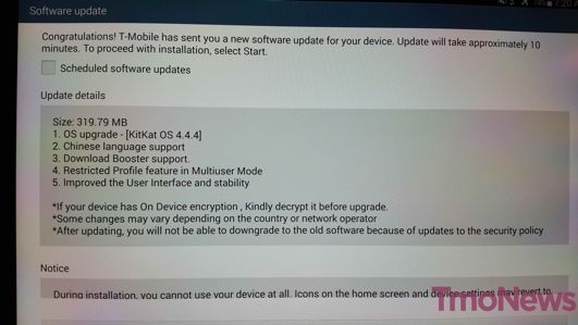 A couple of readers got in touch this morning, and last night, to inform us that they started seeing over-the-air updates arrive for the Samsung Galaxy Note 10.1 2014 edition. This new update weighs in at around 320MB, and includes an update to Android 4.4.4 KitKat. Checking the T-Mobile Support pages reveals that the update rollout started on November 12.
