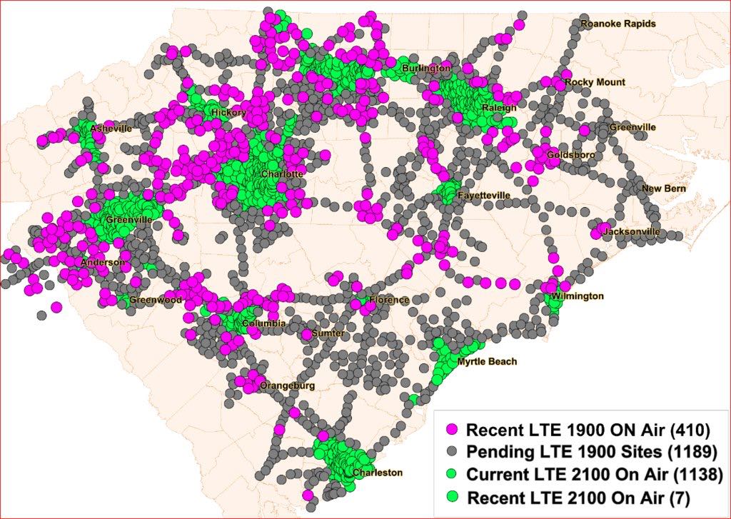 Over the past few weeks, we’ve been sent a number of new LTE sightings all across the States, in some very rural towns and roads. We’ll focus on the big one first: North Carolina. A reader sent in the following map/graphic which shows sites where LTE is going live, and where it’s going to be live soon, and all looks good for the areas in an around Charlotte, NC.As with a lot of new LTE sites, virtually all the upcoming upgrades are on the 1900 band.