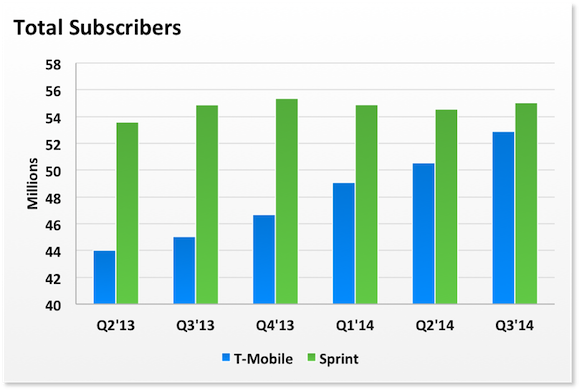 Sprint’s total subscriber base now consists of just over 55 million customers following a quarter in which it added just under half a million subs thanks to strong wholesale connections. T-Mobile added 2.3 million customers to reach within a hair’s breadth of 53 million subs (now at 52.9M). And if it can continue with its momentum, Magenta could catch Old Yeller by next quarter.