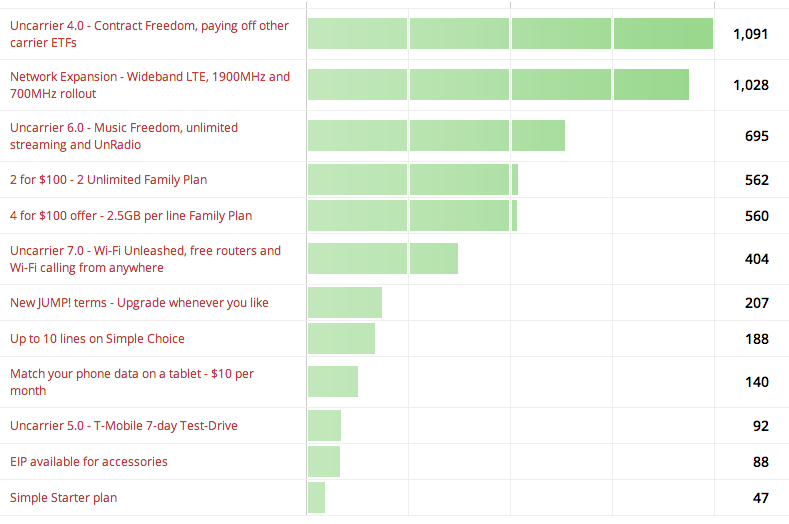 In third place – some way behind with just 695 votes – Uncarrier 6.0 and the offer of unlimited music streaming grabbed 13.6% of the votes cast.