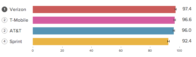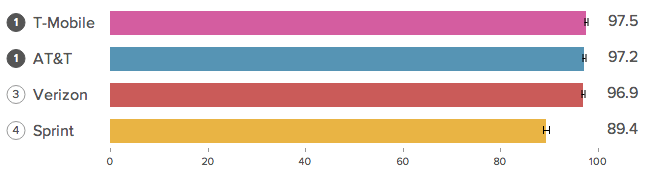 For the second consecutive time, T-Mobile and AT&T ended up sharing first place overall with scores of 97.5 and 97.2 respectively. Verizon was just behind them with a score of 96.9 and Sprint was in fourth place with 89.4.