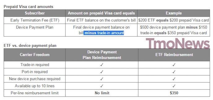 With the ETF reimbursement – announced during Uncarrier 4.0 in January 2014 – customers get the final ETF balance amount on a prepaid Visa card. So, if you need to pay Verizon or AT&T $200 to end your contract with them early, that’s what you get. You’re also required to trade in your phone, but that’s a separate amount. There’s also a maximum limit of $350.