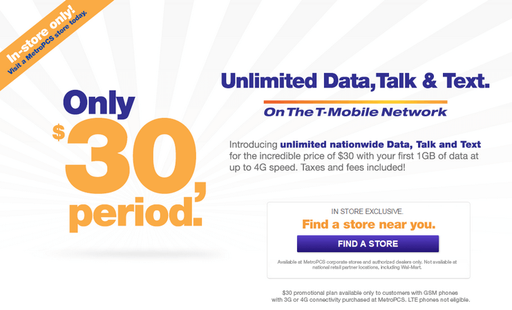 Today, MetroPCS – T-Mobile’s primary prepaid brand – announced a brand new promotional plan for customers who walk in to its stores. For $30 per month (including taxes/fees) subscribers can walk out with unlimited talk, text and data with 1GB 4G data.