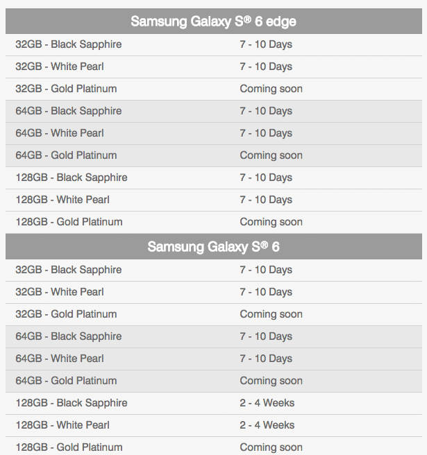 T-Mobile will be offering the 32GB and 64GB models of the S6 and S6 Edge from launch in Black Sapphire and White Pearl. 128GB models of the S6 in black and white will also be available and – along with the aforementioned models – have a 7-10 day shipping estimate if ordered from today. The 128GB model of the S6 Edge in white and black has an estimated shipping time of 2-4 weeks while gold models of all devices simply states “coming soon” with no specific ETA.