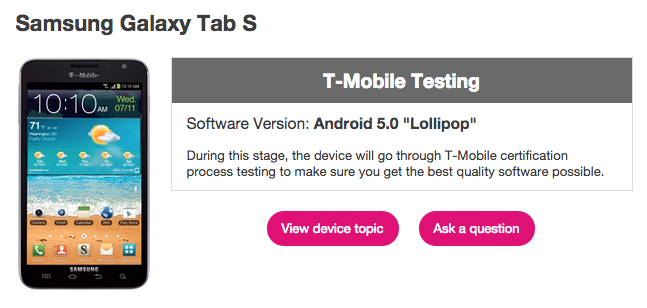 One of our readers got in touch this morning to inform us that the Android 5.0 Lollipop update for the Samsung Galaxy Tab S on T-Mobile is beginning its rollout today. And he must have caught it early because T-Mo’s general software updates progress page is still showing it as under “T-Mobile Testing”.