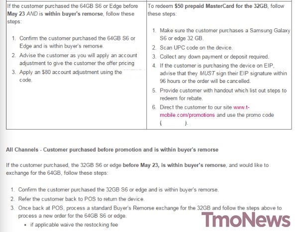 Here’s where it gets a little interesting – some customers who have recently bought one of the phones from T-Mobile branded channels can also get in on the deal. The memo notes that “customers who purchased the S6 or S6 Edge before May 23 AND are in buyer’s remorse can: