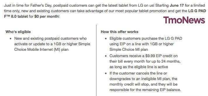 New and existing postpaid customers who activate/update to a 1GB or higher mobile internet plan will qualify for the promotion. Customers will be required to sign up using EIP to pay for their LG G Pad and – just like the previous Alcatel offer – will have their $9.99 installment refunded every month for two years. If the customer cancels the line or downgrades to an ineligible plan, they will have to pay the rest of their EIP balance.