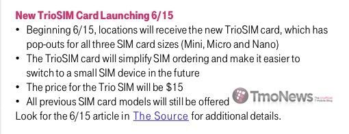 First off, from June 15 (this coming Monday), T-Mobile retail locations will begin receiving TrioSIM packs. As you’d expect from the name, the SIM is made up of all three standard SIM card sizes: Mini, Micro and Nano. The aim – of course – is to make it easier for customers to switch devices without having to get a brand new, different sized SIM card as well.
