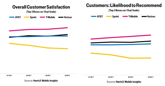 The HarrisX results show T-Mobile on top in both categories throughout 2017. Verizon finished 2017 in second place in both categories, while AT&T came in third and Sprint finished fourth.