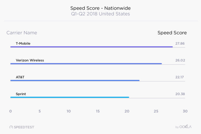 T-Mobile was the fastest carrier in the U.S. in the first and second quarters of 2018, says Ookla. T-Mobile finished with a Speed Score of 27.86, with Verizon coming in second at 26.02, AT&T in third with 22.17, and Sprint in fourth with 20.38. The Speed Score is a metric that incorporates download and upload speeds, with 90 percent of the Speed Score attributed to download speed and 10 percent to upload speed.