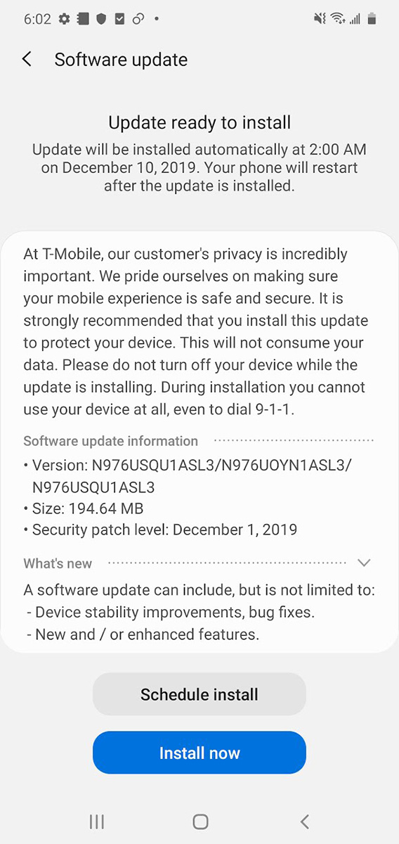 The Galaxy Note 10+ 5G is getting an update to version N976USQU1ASL3 that weighs in at 194.64MB. According to T-Mobile, this update includes “QC patches to improve stability”. It’s based on the December 1, 2019 Android security patch level.