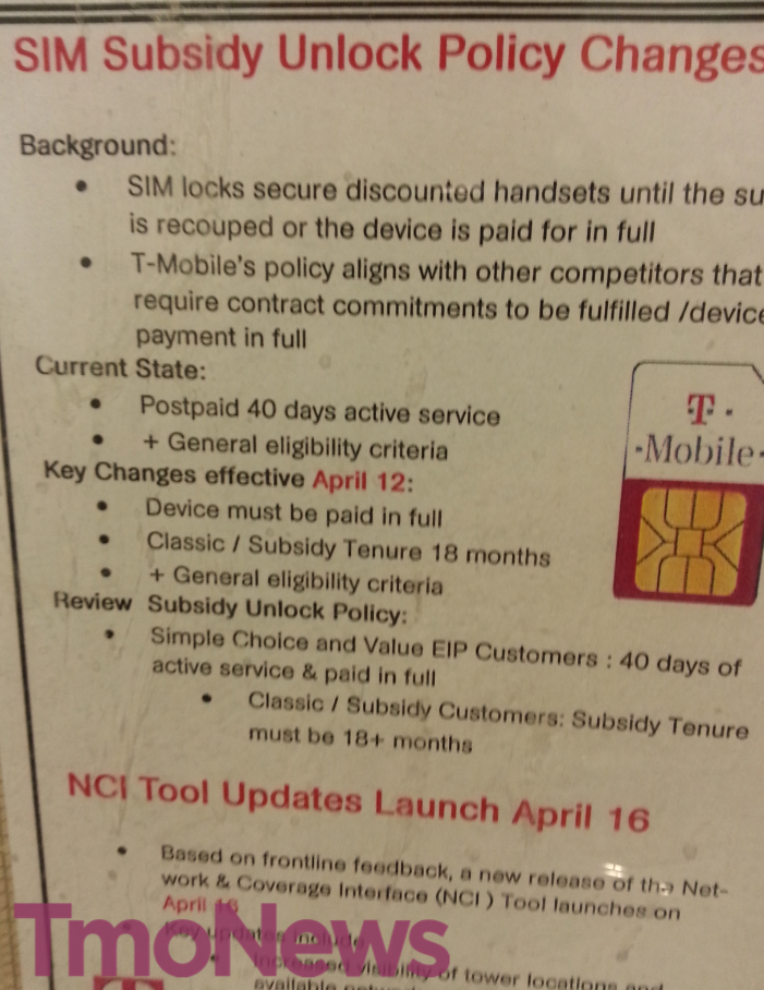 Update: See below. There seems to be a lot of questions on T-Mobile’s new device unlock policy so I’m hoping to clear the air with the above image. As of April 12th, T-Mobile has enacted new requirements for device unlocks, which differ sharply from the previous unlock policy. As of April 12th, device unlocks on T-Mobile require: Devices must be paid in full … [read full article]